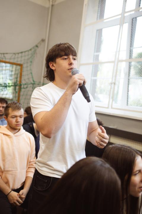 Młodzież miała wyjątkową okazję najpierw wysłuchać krótkiego wykładu Pana profesora na temat jego pracy, a następnie osobiście zadać mu pytania na różne tematy. O jakości i zainteresowaniu spotkaniem niech świadczy mikrofon, który bez zatrzymania przechodził z rąk do rąk.
