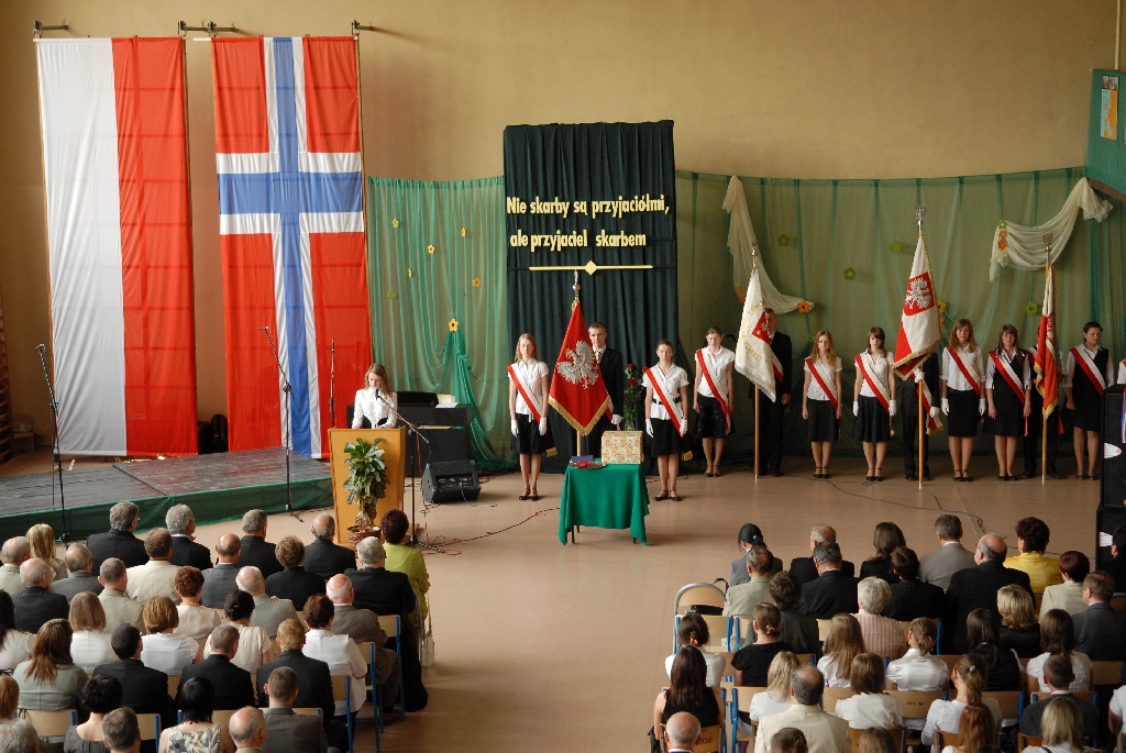Rozpoczął się dość długi proces wyłaniania kandydatów poszczególnych środowisk tworzących społeczność szkolną. Ostatecznie po długich dyskusjach, w tajnym głosowaniu uczniów i nauczycieli zwyciężył patron-idea - Przyjaźń Polsko-Norweska. Od tej chwili podjęte zostały konkretne przygotowania do nadania szkole imienia w dniu 13 czerwca 2008 roku. Jednocześnie podjęto decyzję o zakupie nowego sztandaru dla szkoły, który miał być symbolem nowego etapu w życiu szkoły. Sztandar to ważny symbol w tradycji szkolnej, dlatego wiele było dyskusji nad jego plastycznym wyrazem. Ostatecznie jego widzialny obraz przedstawia herb miasta Ostrzeszowa wkomponowany w tarczę szkolną, u podstawy której powiewają dwie flagi: Polski i Norwegii, symbolizując przyjaźń obu narodów, tak bardzo obecną w historii naszego miasta. Tło ma barwy powiatowe z herbem powiatu w narożniku, co jest nawiązaniem do faktu, że to właśnie powiat jest organem prowadzącym szkołę.